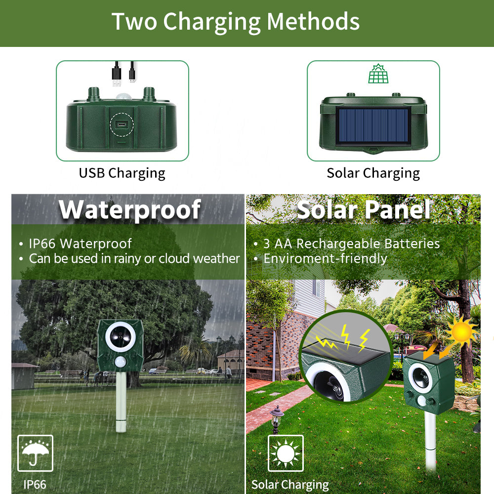 - Ultraschallfrequenz von 13–28,5 kHz erzeugt unsichtbare Reize, die Tiere fernhalten, ohne Menschen zu beeinträchtigen.